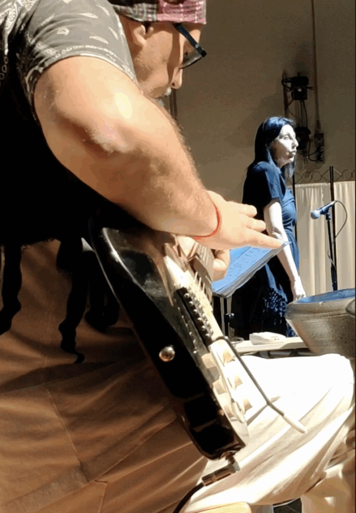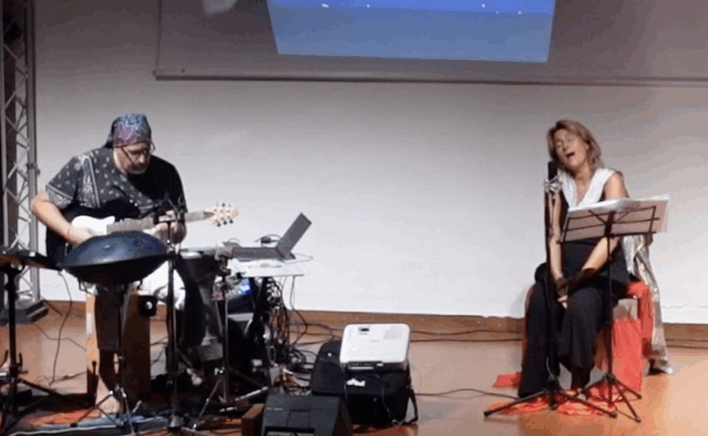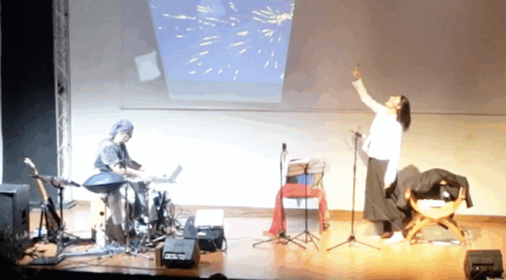 • Alla creazione dell’ambientazione sonora con gli strumenti musicali si integra live sound design e live coding, con sintesi del suono gestita direttamente da linguaggio di programmazione scritto in tempo reale visibile dallo spettatore.