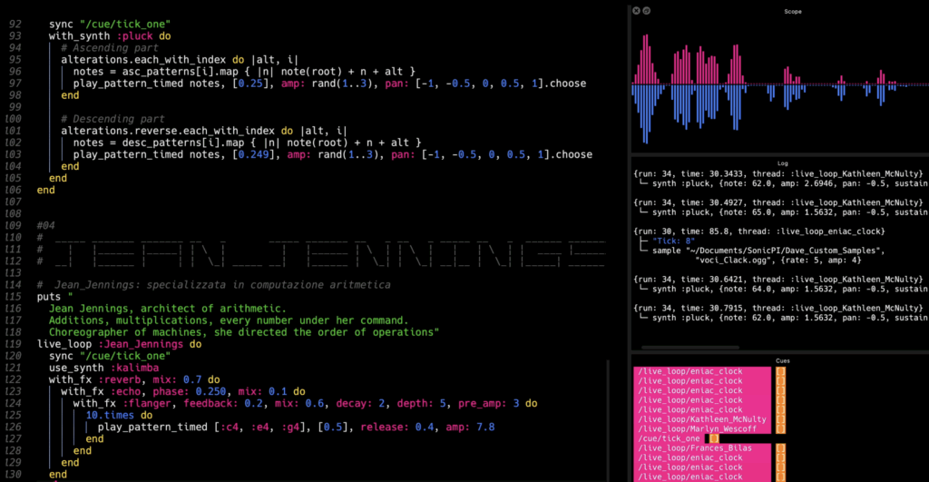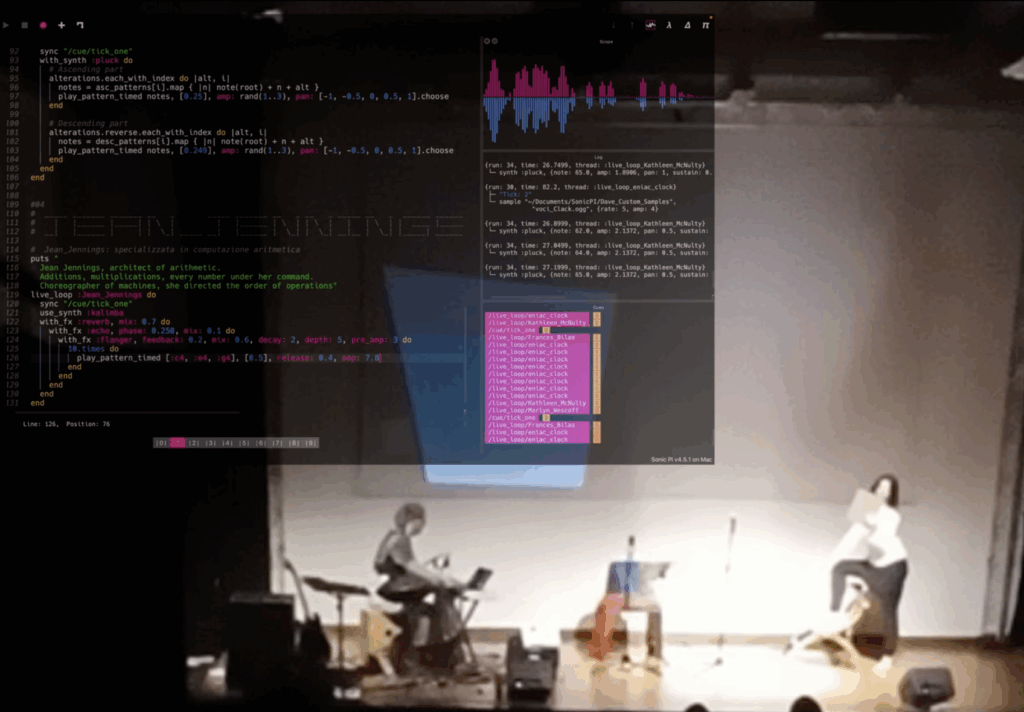 Come tributo alle ENIAC Girls, la narrazione per loro è accompagnata dal LIVE CODING, codice scritto in realtime sotto gli occhi dello spettatore; ogni personaggio è rappresentato da un pezzo di codice che produce una musica correlata con le skill specifiche del personaggio stesso.